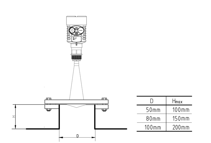 注:使用雷達物位計時,務必保證@高料位不能進入測量盲區(圖中D所示區域)。
